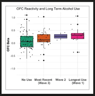 OFC reactivity (beta) by long-term alcohol-use history, with jittered individual observations on box plots.This line of work aims to make predictions about when an individual may be particularly susceptible to giving into tempting cues. Adolescents have been characterized as a vulnerable population due to their heightened sensitivity to rewards. Neurobiological models characterize adolescents’ hypersensitivity to rewards as a result of a developmental imbalance between a slower-to-develop prefrontal cortex and a faster-to-develop striatal system. Thus, this line of work focuses on identifying neural markers of self-regulation in adolescents. A first study (Londerée et al., 2018, Londerée et al., in prep) examined how alternative tobacco marketing influences teen non-smokers using a multimodal approach involving fMRI, DTI, and eye-tracking. Adolescents’ neural and behavioral sensitivity to naturalistic flavored alternative tobacco ads were examined. Neural reward response is increased when tobacco is paired with appetitive flavors, even in non-smokers, due to this heightened sensitivity to reward cues in this population. Individuals that showed an increased attention towards ads subsequently reported a stronger willingness to try alternative tobacco. In addition, structural connectivity between regions involved in self-control (IFG) and reward (OFC) was associated with reduced reward reactivity to food cues. These findings suggest a neural mechanism for how marketing with appetitive cues can make inroads into adolescents’ attention and potentially lead to initiation of unhealthy behaviors.