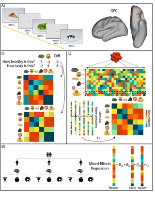 Schematic depicting the localization of the lOFC cluster and the representational similarity analysis from Londerée and Wagner, 2020.One line of research examines a feature that has been shown to be important for self-control; mindset. The mindset that people adopt when making decisions about food is associated with more or less self-control success. For example, when people evaluate foods with a taste mindset (i.e., focusing on the taste of the food), they desire to consume more unhealthy foods than when they adopt a health mindset (i.e., focusing on the health benefits of the food). Functional neuroimaging studies examining neural responses to food have shown that appetitive food images are associated with activity in the brain’s reward system. Understanding how different mindsets may alter neural responses to appetitive food cues may offer insight into why taste mindsets are associated with poorer self-control than health mindsets. A first study (Londerée and Wagner, 2020) investigated the neural representations of food items varying in taste and health using representational similarity analysis (RSA).Neural activity patterns in the orbital frontal cortex (OFC) spontaneously encodes food health, whereas tastiness was associated with greater neural dissimilarity. Subsequent analyses using model dissimilarity matrices that encode overall tastiness magnitude demonstrated that the neural representation of foods grows more distinct with increasing tastiness but not with increasing health. This suggests neural and cognitive representations of food categories that are the highest in tastiness are more refined than those lower in tastiness.